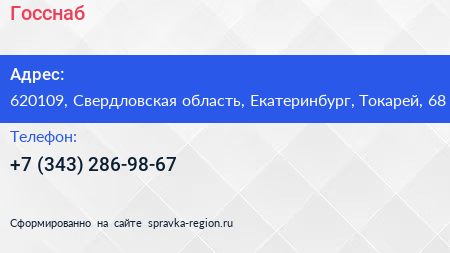 Госснаб по адресу 620109, Свердловская область, Екатеринбург, Токарей, 68 в дальнейшем Организация, размещена в следующих категориях: