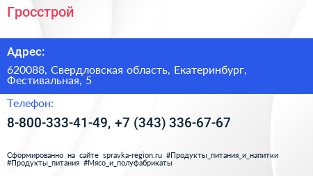 Гросстрой по адресу 620088, Свердловская область, Екатеринбург, Фестивальная, 5 в дальнейшем Организация, размещена в следующих категориях: