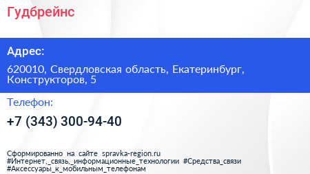 Гудбрейнс по адресу 620010, Свердловская область, Екатеринбург, Конструкторов, 5 в дальнейшем Организация, размещена в следующих категориях: