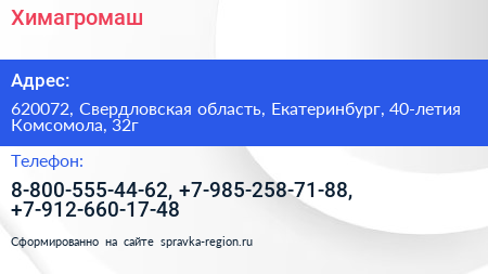 Химагромаш по адресу 620072, Свердловская область, Екатеринбург, 40-летия Комсомола, 32г в дальнейшем Организация, размещена в следующих категориях: