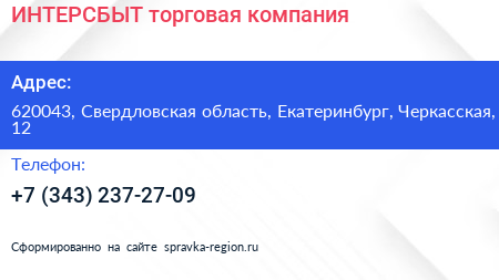 ИНТЕРСБЫТ, торговая компания по адресу 620043, Свердловская область, Екатеринбург, Черкасская, 12 в дальнейшем Организация, размещена в следующих категориях: