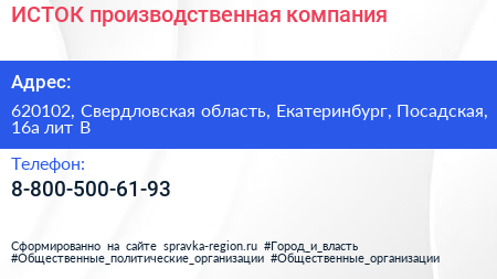 ИСТОК, производственная компания по адресу 620102, Свердловская область, Екатеринбург, Посадская, 16а лит В в дальнейшем Организация, размещена в следующих категориях: