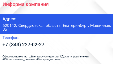 Для связи с организацией воспользуйтесь номером телефона: +7 (343) 227-02-27. Пн: c 09:00-18:00, Вт: c 09:00-18:00, Ср: c 09:00-18:00, Чт: c 09:00-18:00, Пт: c 09:00-18:00, Сб: выходной, Вс: выходной, вы можете обратиться в эту организацию.