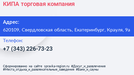 КИПА, торговая компания по адресу 620109, Свердловская область, Екатеринбург, Крауля, 9а в дальнейшем Организация, размещена в следующих категориях: