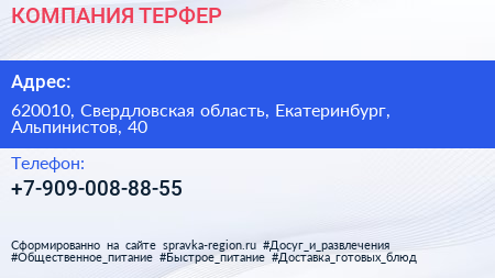 КОМПАНИЯ ТЕРФЕР по адресу 620010, Свердловская область, Екатеринбург, Альпинистов, 40 в дальнейшем Организация, размещена в следующих категориях:
