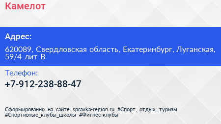 Камелот по адресу 620089, Свердловская область, Екатеринбург, Луганская, 59/4 лит В в дальнейшем Организация, размещена в следующих категориях: