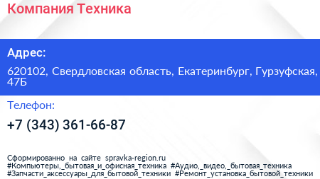Компания Техника по адресу 620102, Свердловская область, Екатеринбург, Гурзуфская, 47Б в дальнейшем Организация, размещена в следующих категориях:
