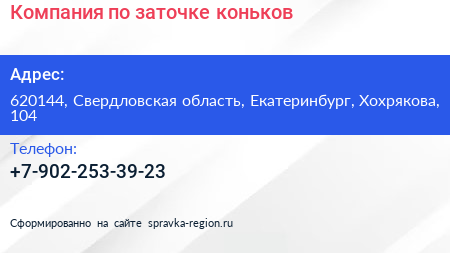 Компания по заточке коньков по адресу 620144, Свердловская область, Екатеринбург, Хохрякова, 104 в дальнейшем Организация, размещена в следующих категориях: