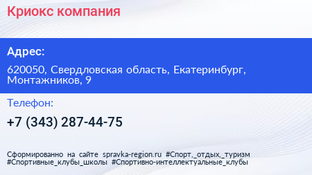 Криокс, компания по адресу 620050, Свердловская область, Екатеринбург, Монтажников, 9 в дальнейшем Организация, размещена в следующих категориях: