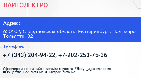 ЛАЙТЭЛЕКТРО по адресу 620102, Свердловская область, Екатеринбург, Пальмиро Тольятти, 32 в дальнейшем Организация, размещена в следующих категориях: