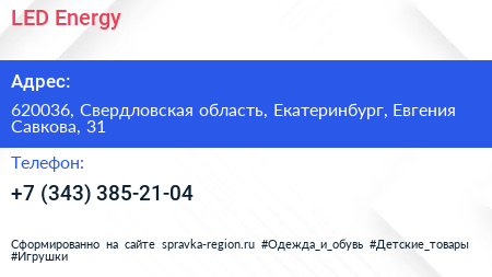 LED Energy по адресу 620036, Свердловская область, Екатеринбург, Евгения Савкова, 31 в дальнейшем Организация, размещена в следующих категориях: