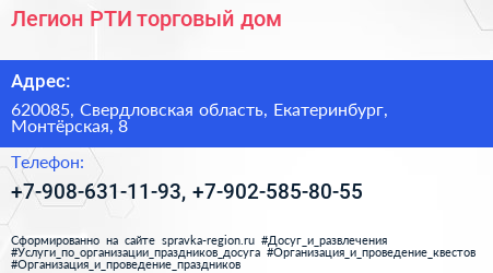 Легион-РТИ, торговый дом по адресу 620085, Свердловская область, Екатеринбург, Монтёрская, 8 в дальнейшем Организация, размещена в следующих категориях: