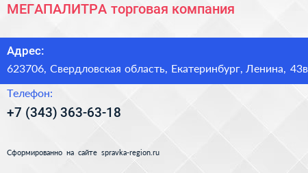 МЕГАПАЛИТРА, торговая компания по адресу 623706, Свердловская область, Екатеринбург, Ленина, 43в в дальнейшем Организация, размещена в следующих категориях: