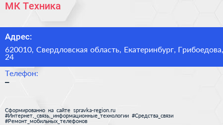 МК Техника по адресу 620010, Свердловская область, Екатеринбург, Грибоедова, 24 в дальнейшем Организация, размещена в следующих категориях: