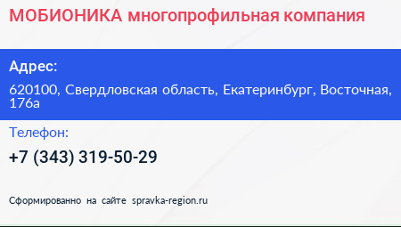 МОБИОНИКА, многопрофильная компания по адресу 620100, Свердловская область, Екатеринбург, Восточная, 176а в дальнейшем Организация, размещена в следующих категориях: