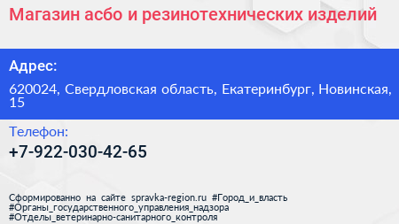 Магазин асбо и резинотехнических изделий по адресу 620024, Свердловская область, Екатеринбург, Новинская, 15 в дальнейшем Организация, размещена в следующих категориях: