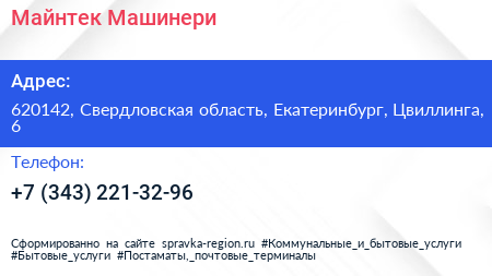 Майнтек Машинери по адресу 620142, Свердловская область, Екатеринбург, Цвиллинга, 6 в дальнейшем Организация, размещена в следующих категориях: