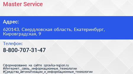 Master Service по адресу 620143, Свердловская область, Екатеринбург, Кировградская, 9 в дальнейшем Организация, размещена в следующих категориях: