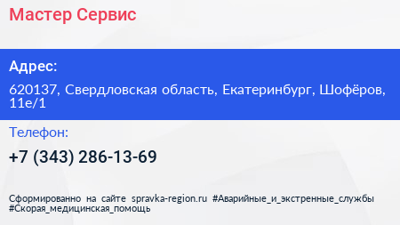 Мастер-Сервис по адресу 620137, Свердловская область, Екатеринбург, Шофёров, 11е/1 в дальнейшем Организация, размещена в следующих категориях:
