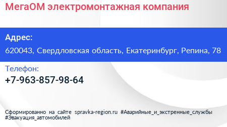 МегаОМ, электромонтажная компания по адресу 620043, Свердловская область, Екатеринбург, Репина, 78 в дальнейшем Организация, размещена в следующих категориях: