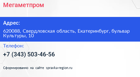 Мегаметпром по адресу 620088, Свердловская область, Екатеринбург, бульвар Культуры, 10 в дальнейшем Организация, размещена в следующих категориях: