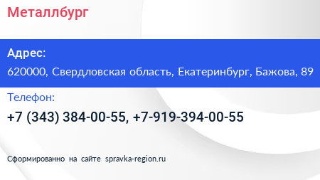 Металлбург по адресу 620000, Свердловская область, Екатеринбург, Бажова, 89 в дальнейшем Организация, размещена в следующих категориях: