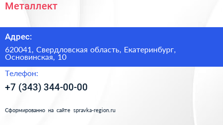 Металлект по адресу 620041, Свердловская область, Екатеринбург, Основинская, 10 в дальнейшем Организация, размещена в следующих категориях: