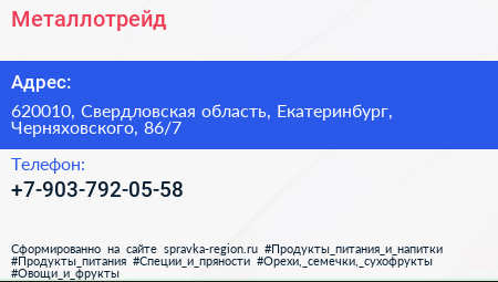 Металлотрейд по адресу 620010, Свердловская область, Екатеринбург, Черняховского, 86/7 в дальнейшем Организация, размещена в следующих категориях: