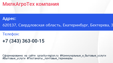 МилкАгроТех, компания по адресу 620137, Свердловская область, Екатеринбург, Бехтерева, 3 в дальнейшем Организация, размещена в следующих категориях: