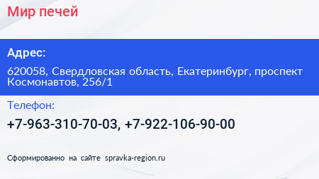 Мир печей по адресу 620058, Свердловская область, Екатеринбург, проспект Космонавтов, 256/1 в дальнейшем Организация, размещена в следующих категориях: