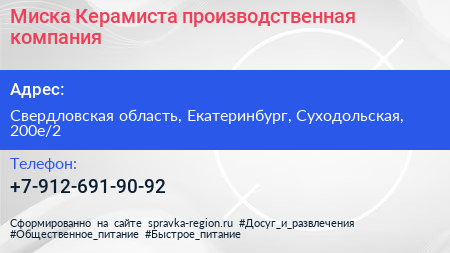 Миска Керамиста, производственная компания по адресу Свердловская область, Екатеринбург, Суходольская, 200е/2 в дальнейшем Организация, размещена в следующих категориях: