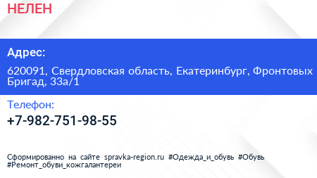 НЕЛЕН по адресу 620091, Свердловская область, Екатеринбург, Фронтовых Бригад, 33а/1 в дальнейшем Организация, размещена в следующих категориях: