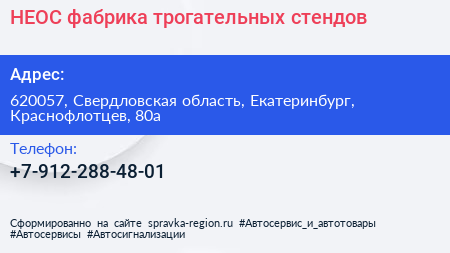 НЕОС, фабрика трогательных стендов по адресу 620057, Свердловская область, Екатеринбург, Краснофлотцев, 80а в дальнейшем Организация, размещена в следующих категориях: