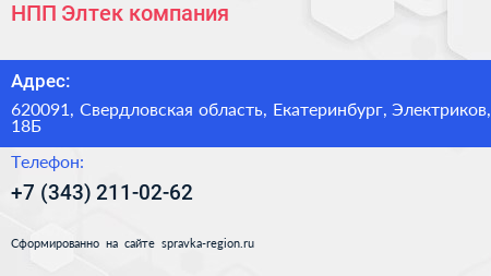 НПП Элтек, компания по адресу 620091, Свердловская область, Екатеринбург, Электриков, 18Б в дальнейшем Организация, размещена в следующих категориях: