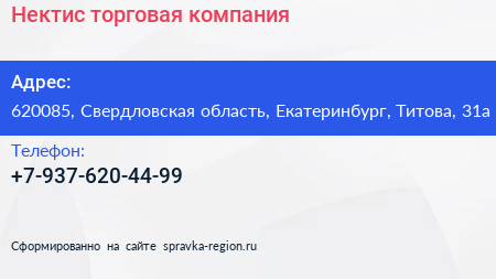Нектис, торговая компания по адресу 620085, Свердловская область, Екатеринбург, Титова, 31а в дальнейшем Организация, размещена в следующих категориях: