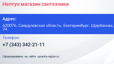 Нептун, магазин сантехники по адресу 620076, Свердловская область, Екатеринбург, Щербакова, 74 в дальнейшем Организация, размещена в следующих категориях:
