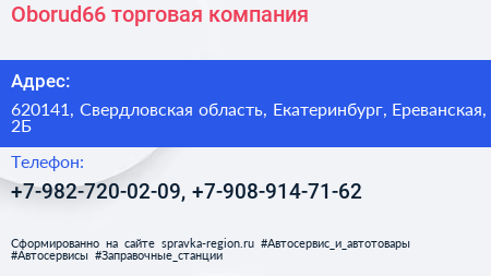 Oborud66, торговая компания по адресу 620141, Свердловская область, Екатеринбург, Ереванская, 2Б в дальнейшем Организация, размещена в следующих категориях: