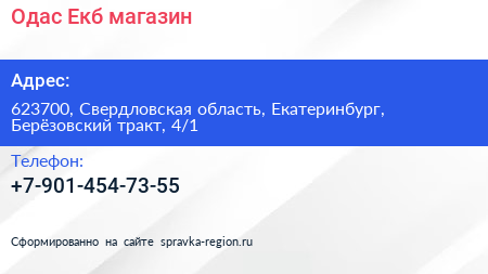 Одас-Екб, магазин по адресу 623700, Свердловская область, Екатеринбург, Берёзовский тракт, 4/1 в дальнейшем Организация, размещена в следующих категориях: