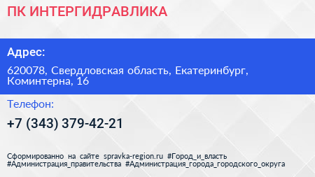ПК ИНТЕРГИДРАВЛИКА по адресу 620078, Свердловская область, Екатеринбург, Коминтерна, 16 в дальнейшем Организация, размещена в следующих категориях: