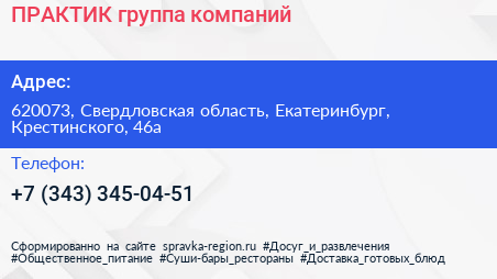 ПРАКТИК, группа компаний по адресу 620073, Свердловская область, Екатеринбург, Крестинского, 46а в дальнейшем Организация, размещена в следующих категориях:
