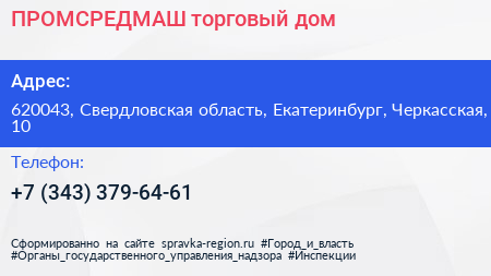 ПРОМСРЕДМАШ, торговый дом по адресу 620043, Свердловская область, Екатеринбург, Черкасская, 10 в дальнейшем Организация, размещена в следующих категориях: