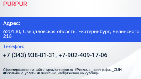 PURPUR по адресу 620130, Свердловская область, Екатеринбург, Белинского, 216 в дальнейшем Организация, размещена в следующих категориях: