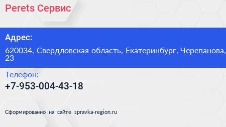 Perets Сервис по адресу 620034, Свердловская область, Екатеринбург, Черепанова, 23 в дальнейшем Организация, размещена в следующих категориях: