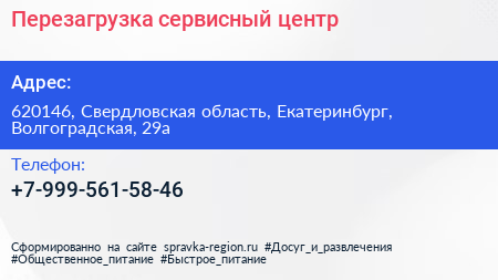 Перезагрузка, сервисный центр по адресу 620146, Свердловская область, Екатеринбург, Волгоградская, 29а в дальнейшем Организация, размещена в следующих категориях: