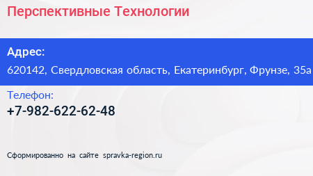 Перспективные Технологии по адресу 620142, Свердловская область, Екатеринбург, Фрунзе, 35а в дальнейшем Организация, размещена в следующих категориях: