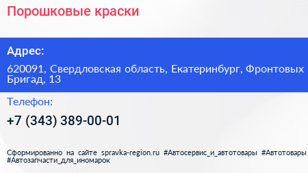 Порошковые краски по адресу 620091, Свердловская область, Екатеринбург, Фронтовых Бригад, 13 в дальнейшем Организация, размещена в следующих категориях:
