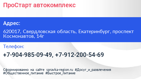 ПроСтарт, автокомплекс по адресу 620017, Свердловская область, Екатеринбург, проспект Космонавтов, 14г в дальнейшем Организация, размещена в следующих категориях: