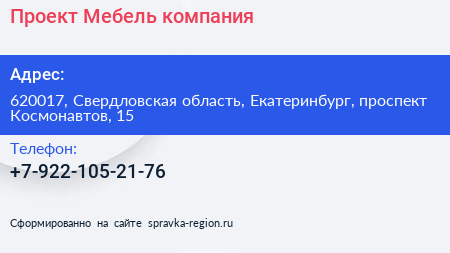 Проект-Мебель, компания по адресу 620017, Свердловская область, Екатеринбург, проспект Космонавтов, 15 в дальнейшем Организация, размещена в следующих категориях: