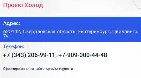 ПроектХолод по адресу 620142, Свердловская область, Екатеринбург, Цвиллинга, 7ч в дальнейшем Организация, размещена в следующих категориях: