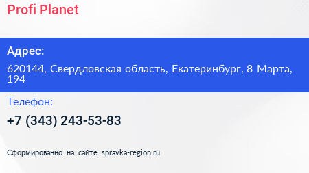 Profi-Planet по адресу 620144, Свердловская область, Екатеринбург, 8 Марта, 194 в дальнейшем Организация, размещена в следующих категориях: